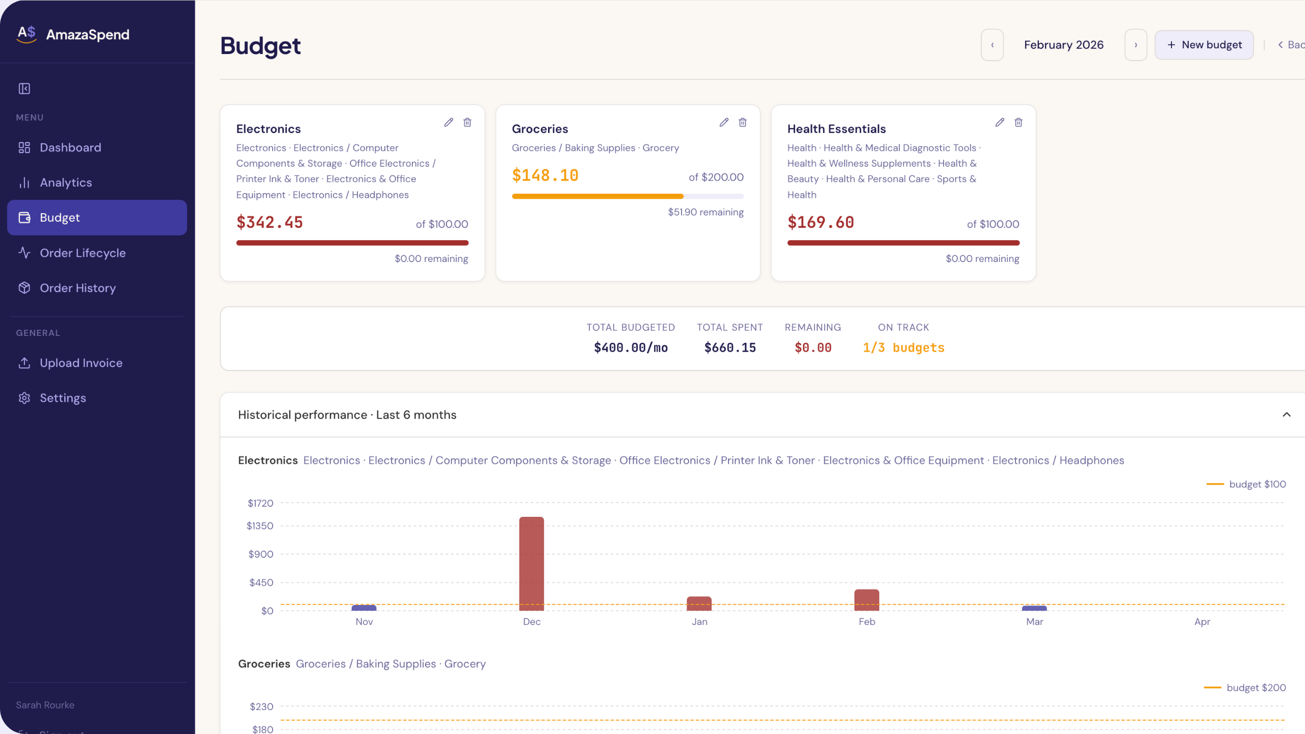 Set a monthly limit for any group of categories — household, tech, kids, whatever matches how you actually shop. AmazaSpend shows you where you stand right now, projects your month-end total based on your current pace, and turns green, amber, or red so you never have to do the math yourself.