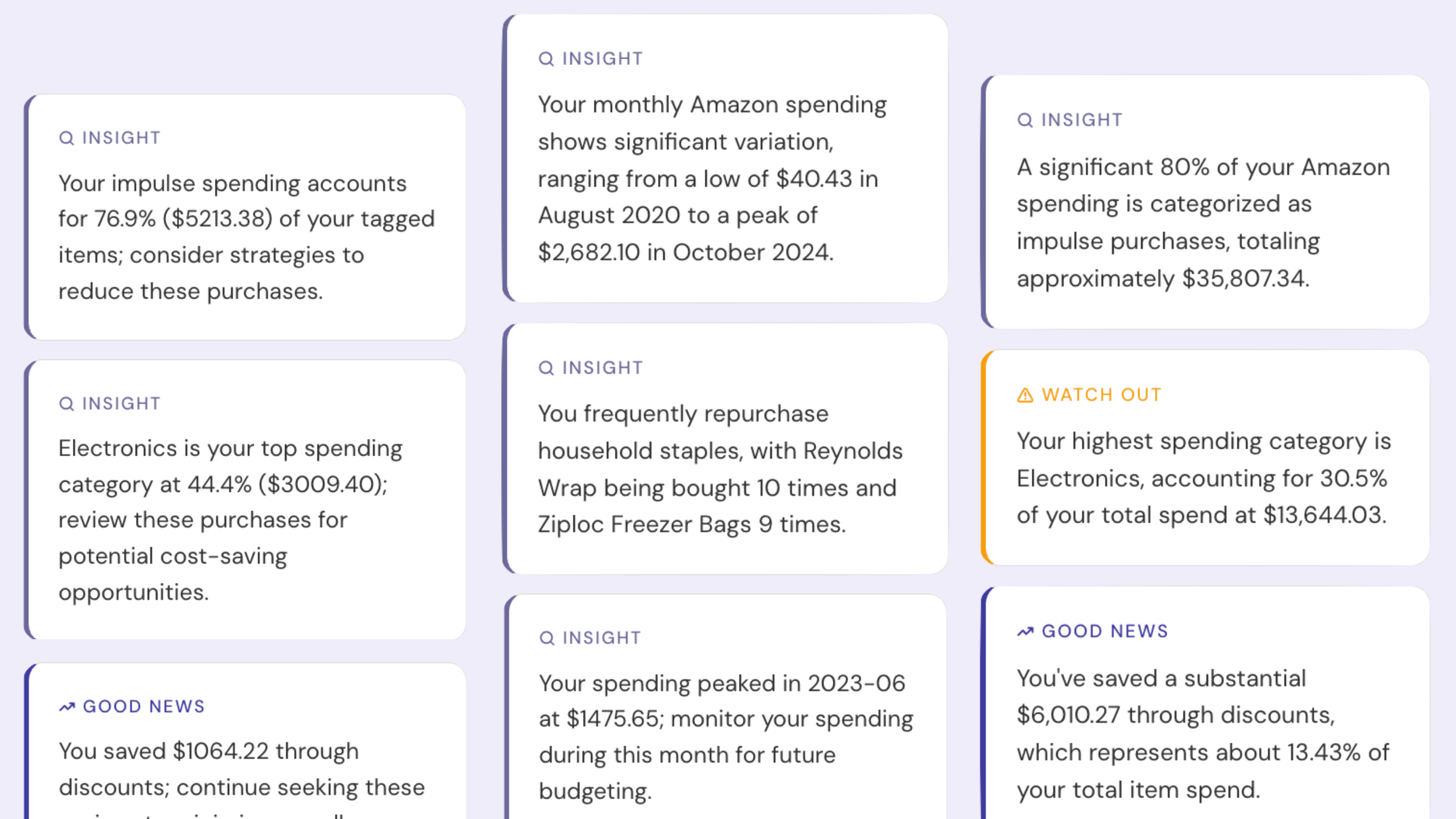 After every upload, get observations specific to you: which categories are creeping up, what your impulse patterns look like, where you're doing well. Your data explained in sentences you can act on.