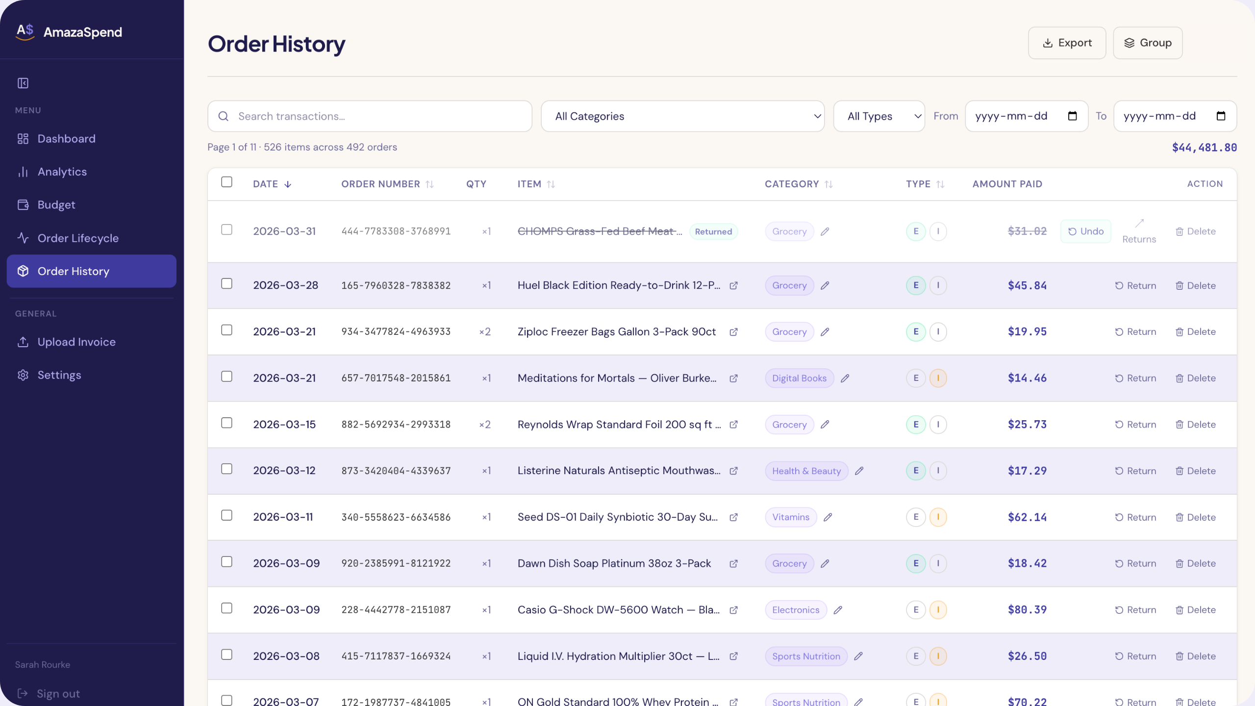 See your total Amazon spending at a glance and answer the question: how much have I spent on Amazon? Every order, item, and return in one scrollable, filterable table. Search by product name, sort by price, filter by category or month, and export everything as a clean CSV.