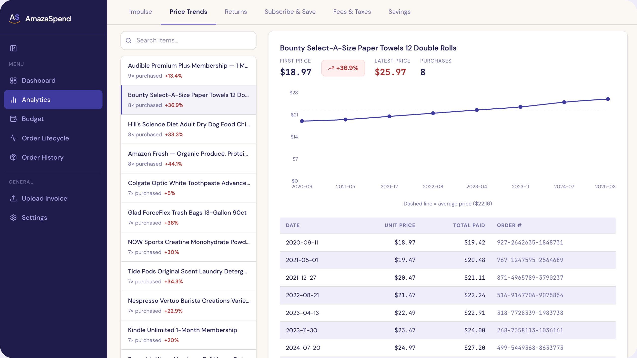 Track the price history of every item you've purchased. Know when you got a deal, and when you paid too much. Spot Subscribe & Save discounts and applied coupons automatically. Discover whether that item you buy every month is quietly getting more expensive.