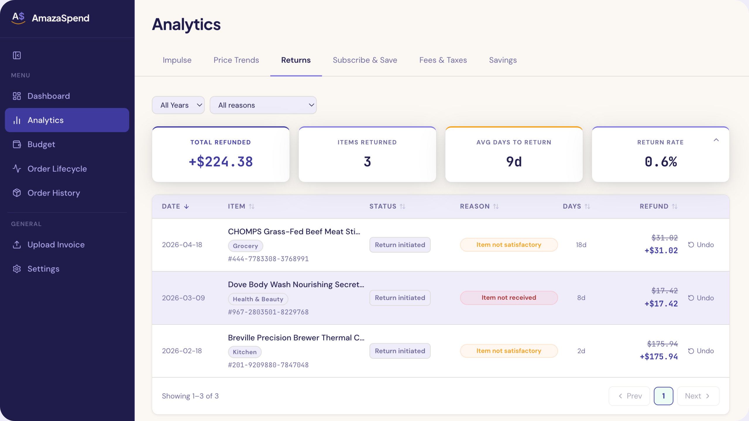 Amazon return status and full refund timeline tracked automatically — no manual entry.